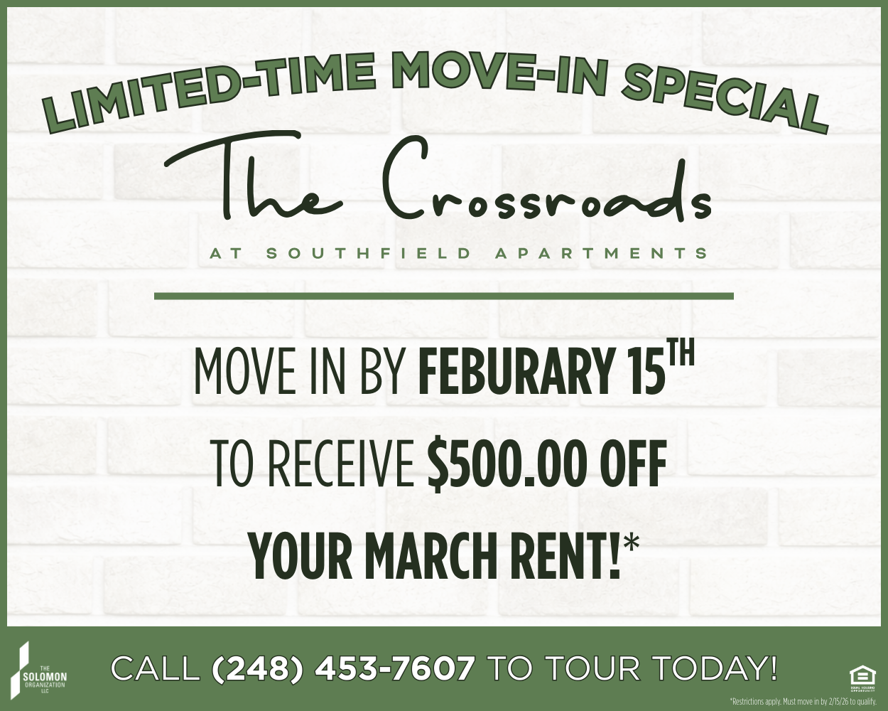 Move into The Crossroads at Southfield by February 15th and receive $500.00 off your February rent. Call now to secure this limited-time move-in special!